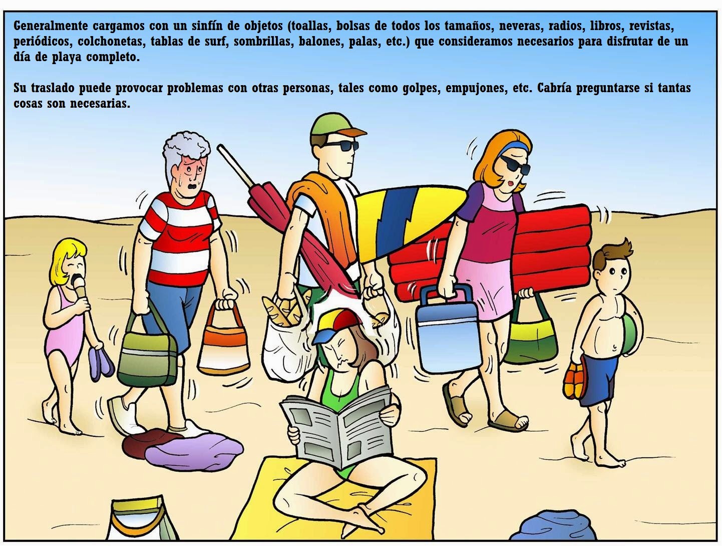 El típico: “espacio-vital-¿y-eso-qué-es?” Suelen llegar tarde pero con garra y luchando por un buen hueco. Traen sombrillas varias y más enseres que en Los Encantes. No tienen percepción del espacio, ven un mini hueco y se tiran en barrena. ¡Aquello es el desembarco de Normandía!